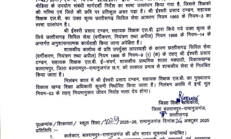 बलरामपुर, विकासखंड बलरामपुर के शासकीय प्राथमिक शाला मक्याठी के सहायक शिक्षक ईश्वरी प्रसाद टंडन के द्वारा प्रधानमंत्री, भारत सरकार के विरूद्ध उनके नाम से अपने फेसबुक पेज पर अपशब्दों का प्रयोग करते हुए अशोभनीय टीप्पणी की गई। जो कि छत्तीसगढ़ सामान्य प्रशासन विभाग के द्वारा जारी अधिकारी-कर्मचारी के सोशल मीडिया के उपयोग संबंधी मार्गदर्शी निर्देश का स्पष्ट उल्लंघन किया गया है।