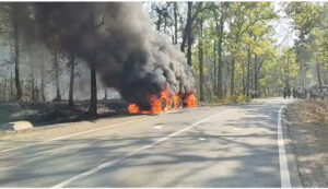 भीषण सड़क हादसा, तेज रफ्तार ट्रेलर पेड़ से टकराया, लगी भीषण आग